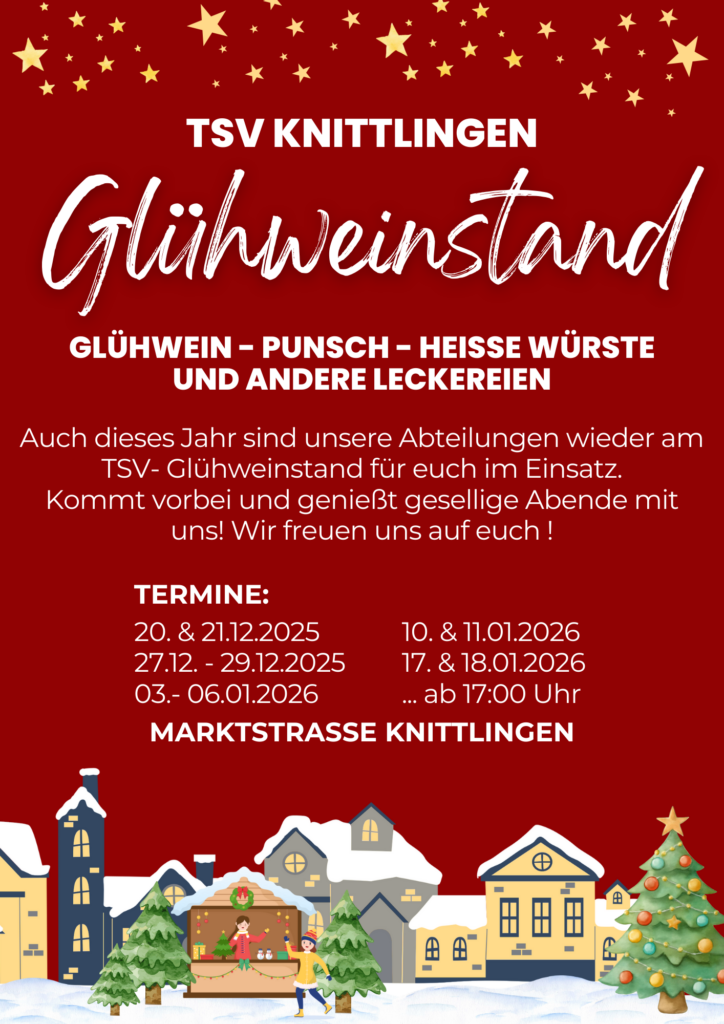 Auch in dieser Wintersaison heißt euch der TSV Gesamtverein wieder herzlich am beliebten Knittlinger Glühweinstand in der Marktstraße willkommen. Unsere Abteilungen sind an mehreren Wochenenden mit viel Engagement für euch im Einsatz und sorgen für gemütliche Stimmung mitten in Knittlingen.