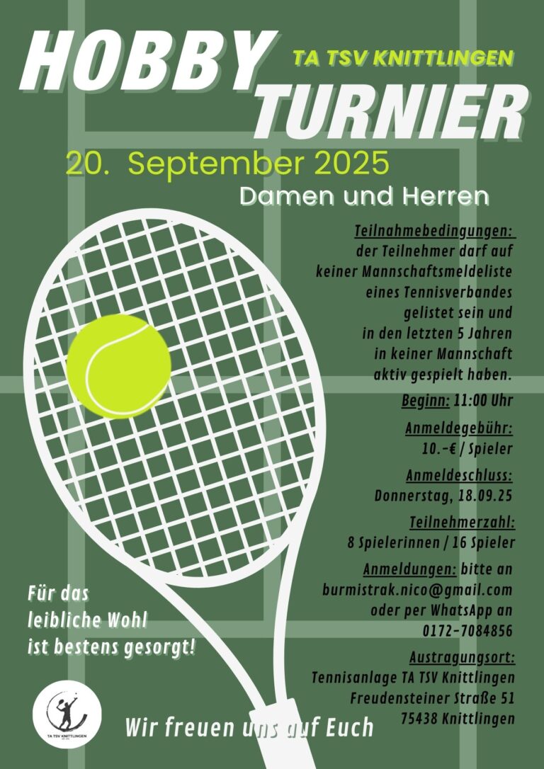 Am Samstag, den 20.09.2025, veranstaltete die Tennisabteilung des TSV Knittlingen bei strahlendem Spätsommerwetter ein Hobby-Turnier für Nichtaktive Tennisliebhaber. Ab 11:30 Uhr gingen motivierte Damen und Herren an den Start – alle mit viel Freude am Spiel und sportlichem Ehrgeiz. Gespielt wurde zunächst im Modus „Jeder gegen Jeden“, bevor die besten Spielerinnen und Spieler in die spannende K.o.-Phase einzogen. Das große Finale bildete den sportlichen Höhepunkt eines rundum gelungenen Tages. Auch abseits des Platzes war für beste Stimmung gesorgt: Mit leckerem Gegrilltem, Kaffee und Kuchen war die Verpflegung ein voller Erfolg. Bei der Siegerehrung durften sich alle Teilnehmenden über Urkunden, Sachpreise und Trostpreise freuen. Besonders gratulieren wir den Tagessiegern: Marco Glöckler bei den Herren und Jasmin Bucher bei den Damen. Ein herzliches Dankeschön an alle Helferinnen und Helfer, die zum Gelingen dieses tollen Turniertages beigetragen haben. Wir freuen uns schon jetzt auf das Hobby-Turnier im nächsten Jahr!